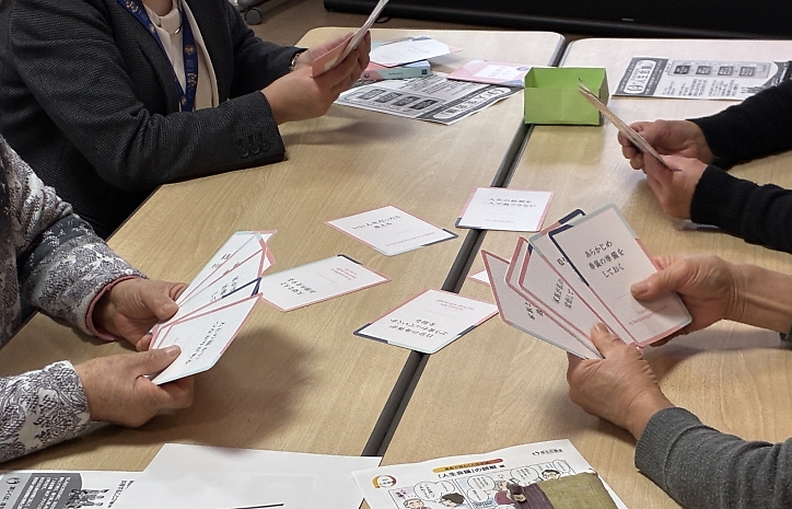 ◆ボランティア交流会(12月5日) 当施設へボランティアに来てくださっている皆さんが集い、「もしバナゲーム」で交流を深めました。「もしバナゲーム」は、治療困難な病気で余命があと半年から1年という設定で、人生の最期にどう在りたいか、自分にとって大切なものや望むケアについて、カードを使って考え、話し合うゲームです。